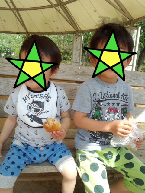 公園でパンを食べてる子供たち。